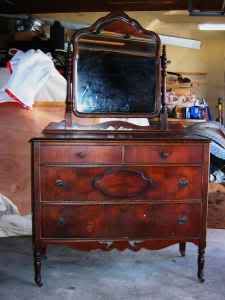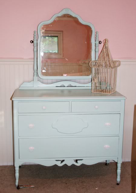 The old antique dresser we bought, missing the mirror -- still needs to be painted blue